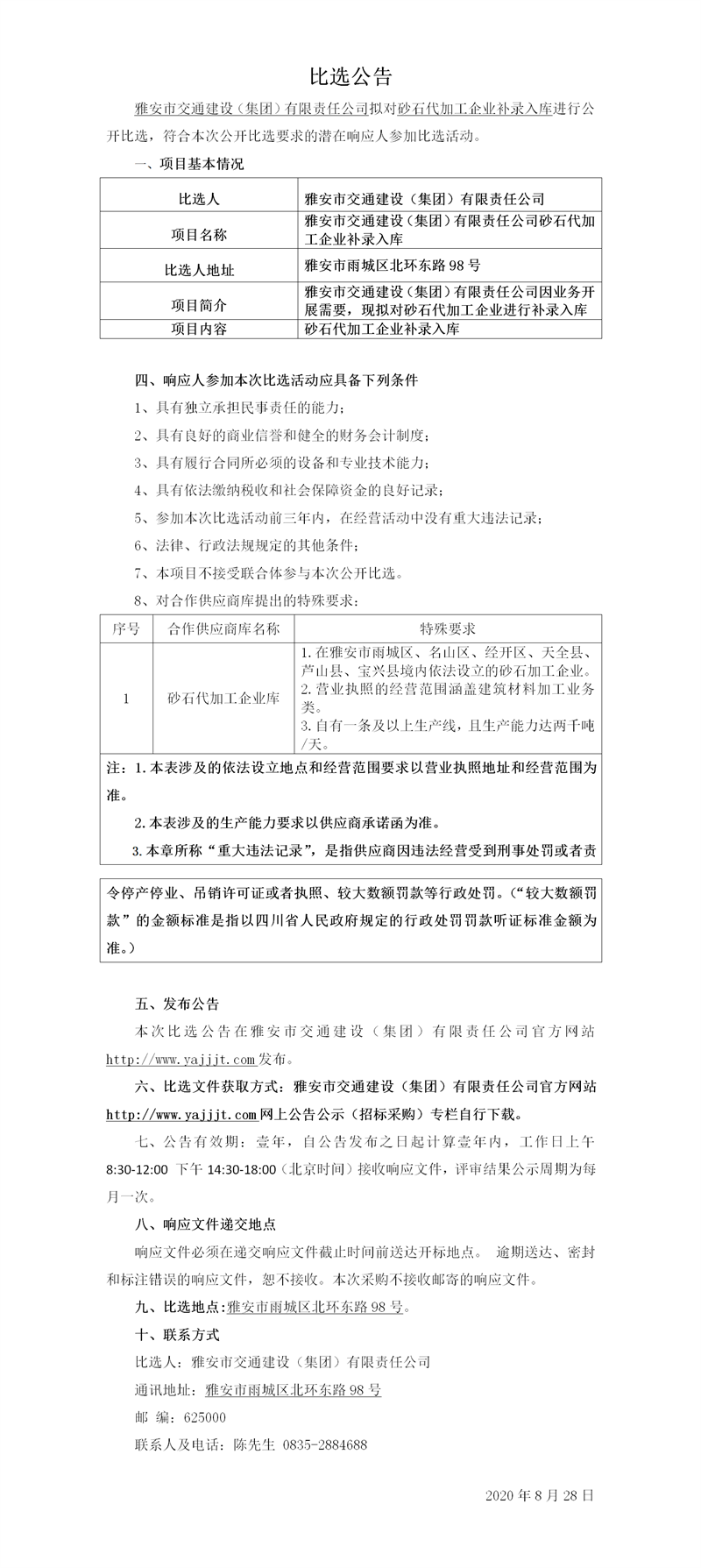 雅安市交通建设(集团)有限责任公司砂石代加工企业补录入库比选公告