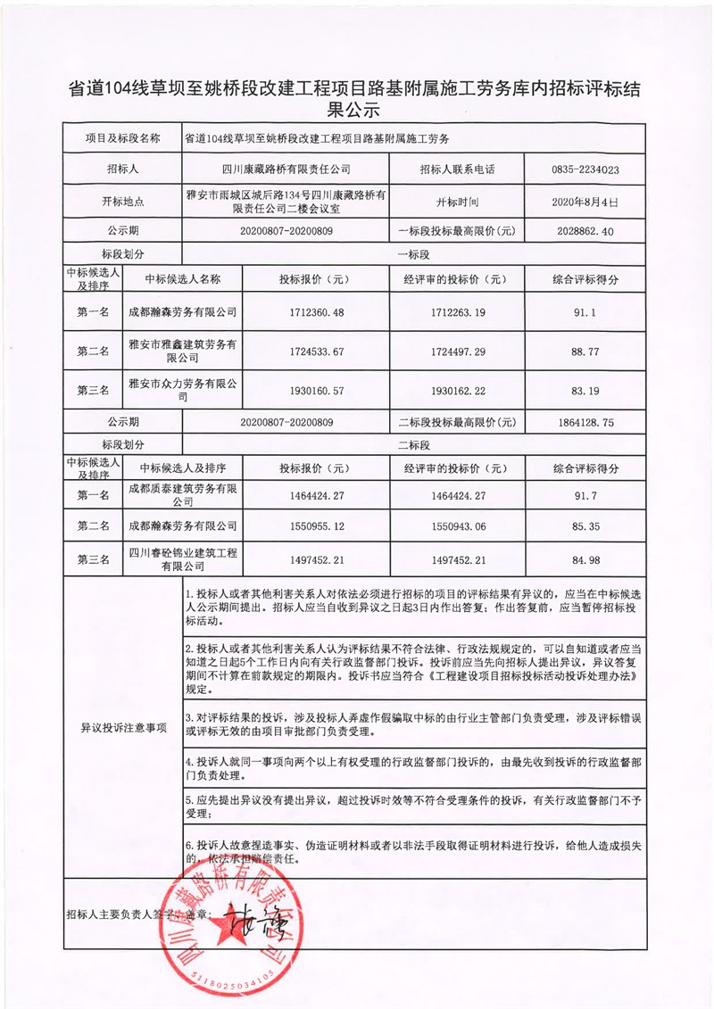 四川康藏路桥有限责任公司省道104线草坝至姚桥段改建工程项目路基附属施工劳务库内招标评标结果公示