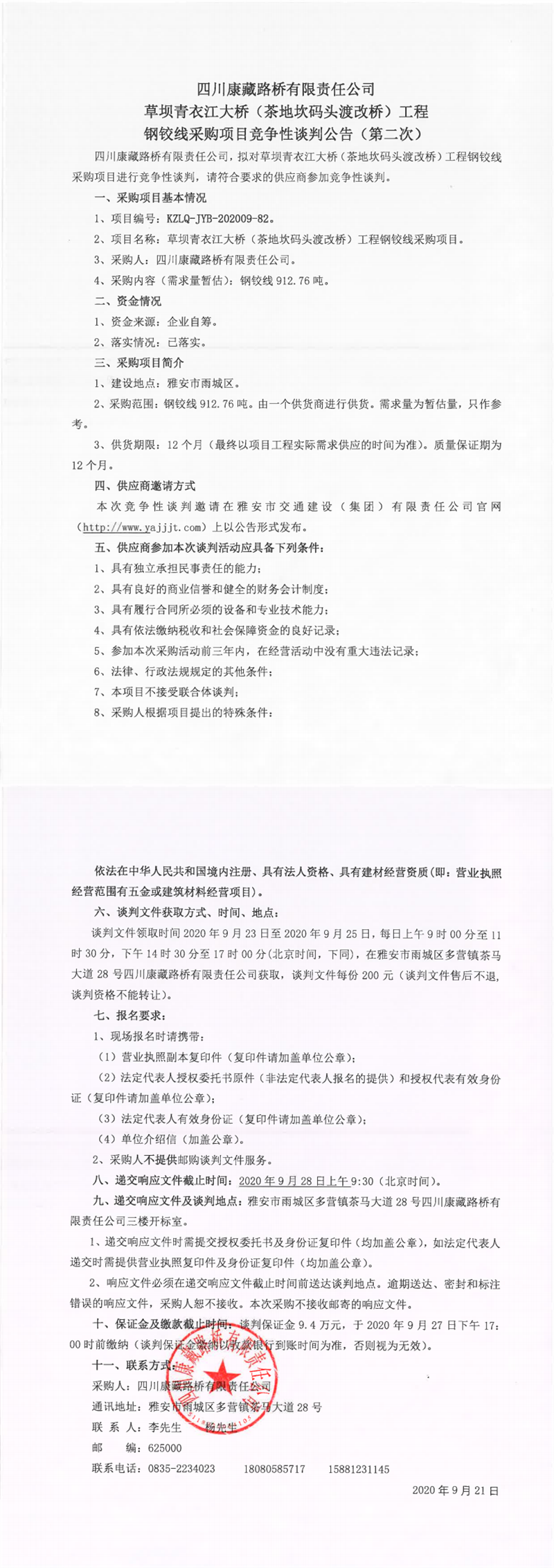 四川康藏路桥有限公司草坝青衣江大桥(茶地坎码头渡改桥)工程钢铰线采购项目竞争性谈判公告(第二次)