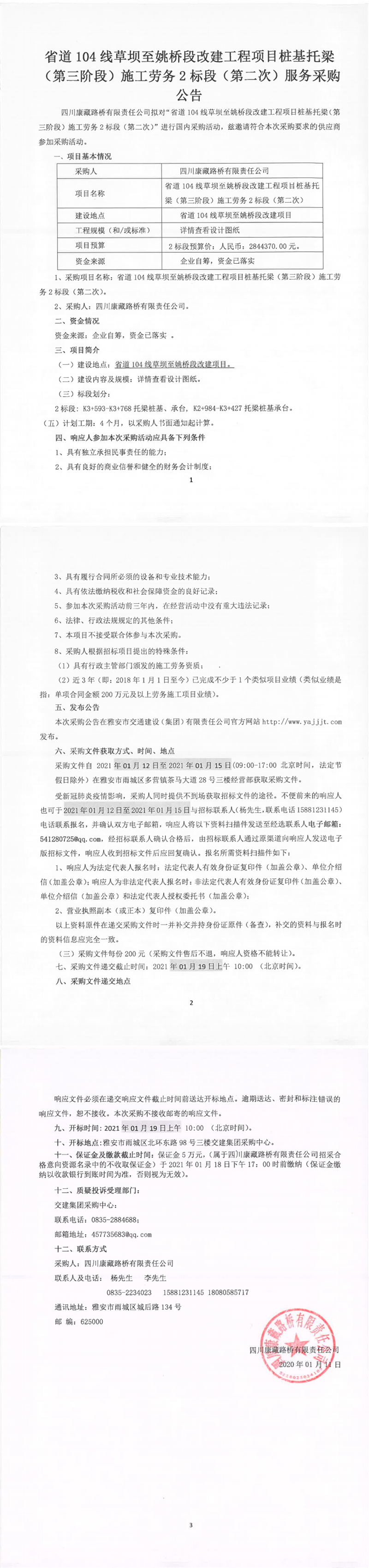 四川康藏路桥有限公司省道104线草坝至姚桥段改建工程项目桩基托梁(第三阶段)施工劳务2标段(第二次)服务采购公告