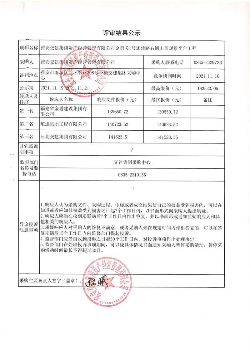 亿万先生MR集团资产经营管理有限公司金鸡关1号还建路右侧山顶观景平台工程评审结果公示