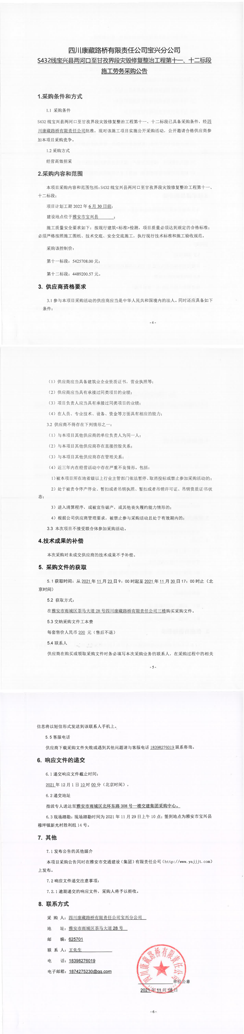 四川康藏路桥有限责任公司宝兴分公司S432线宝兴县两河口至甘孜界段灾毁修复整治工程第十一、十二标段施工劳务采购公告