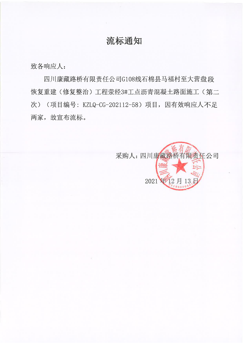 四川康藏路桥有限责任公司G108线石棉县马福村至大营盘段恢复重建(修复整治)工程荥经3#工点沥青混凝土路面施工(第二次)流标通知