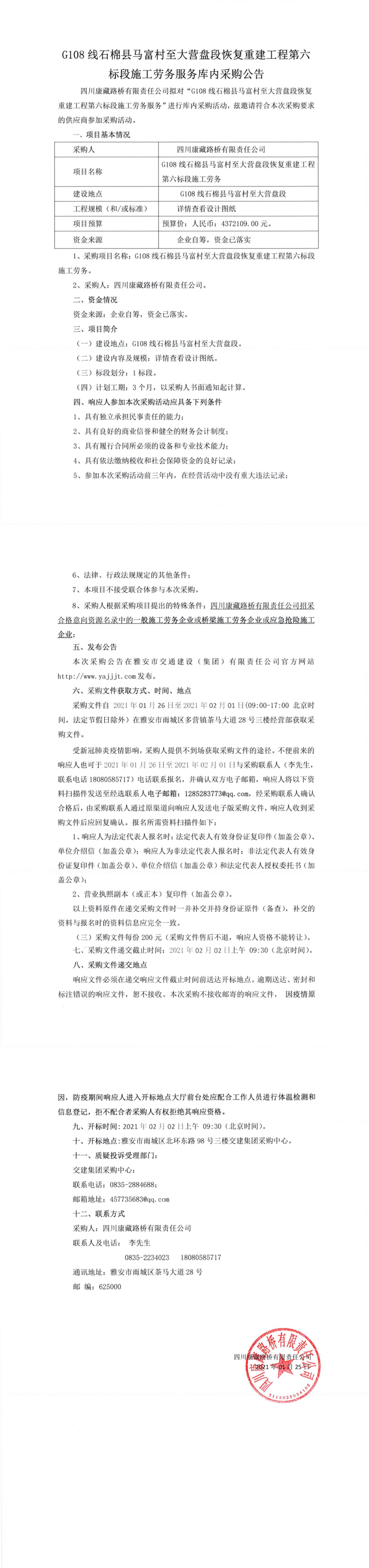 四川康藏路桥有限公司G108线石棉县马富村至大营盘段恢复重建工程第六标段施工劳务服务库内采购公告