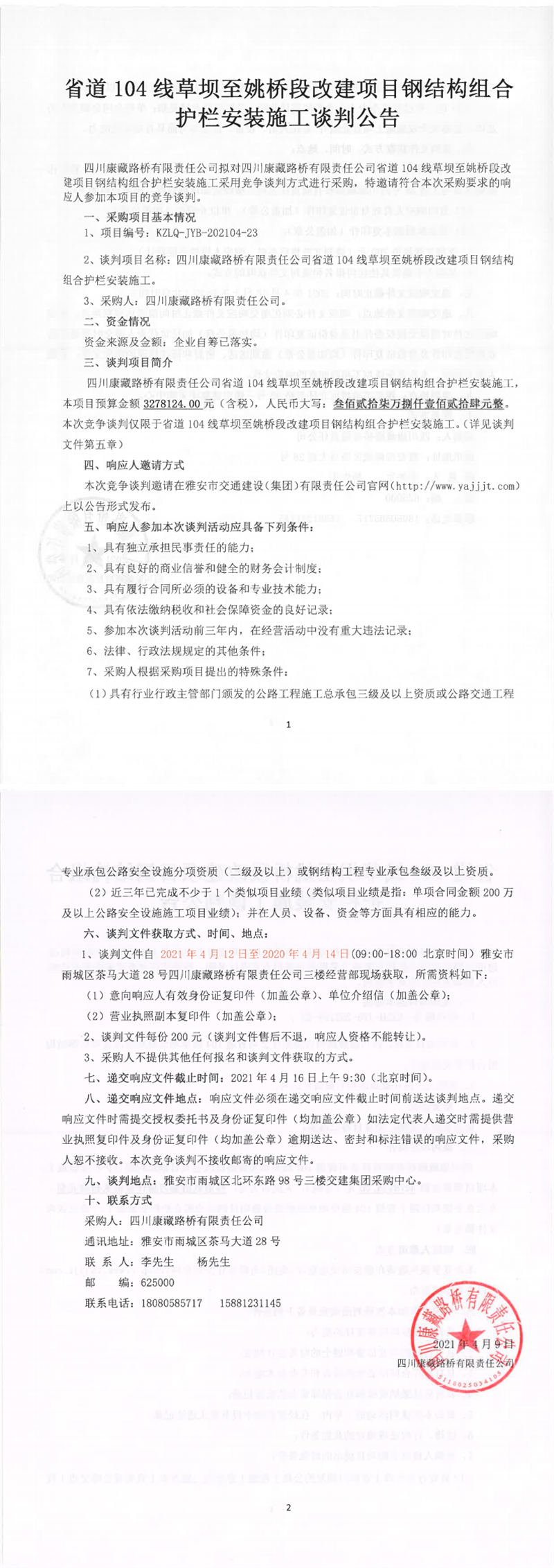 四川康藏路桥有限责任公司省道104线草坝至姚桥段改建项目钢结构组合护栏安装施工谈判公告
