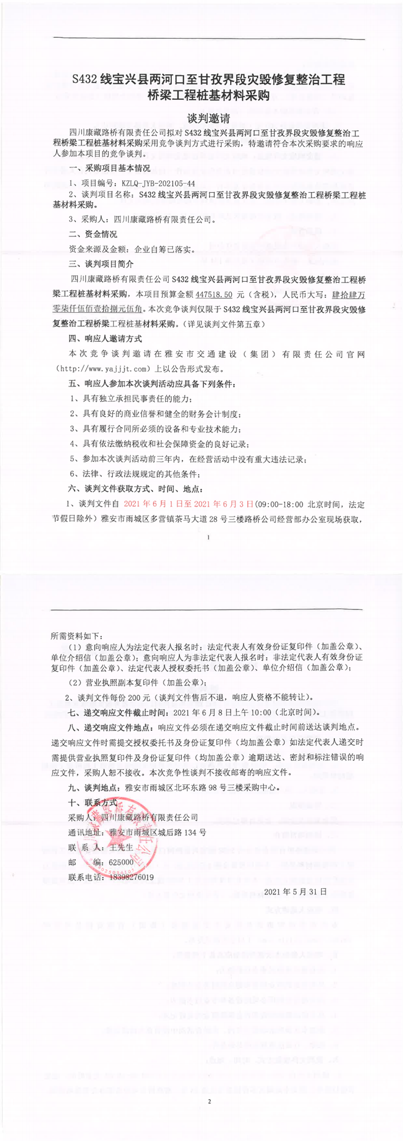四川康藏路桥有限责任公司S432线宝兴县两河口至甘孜界段灾毁修复整治工程桥梁桩基材料采购竞争谈判公告