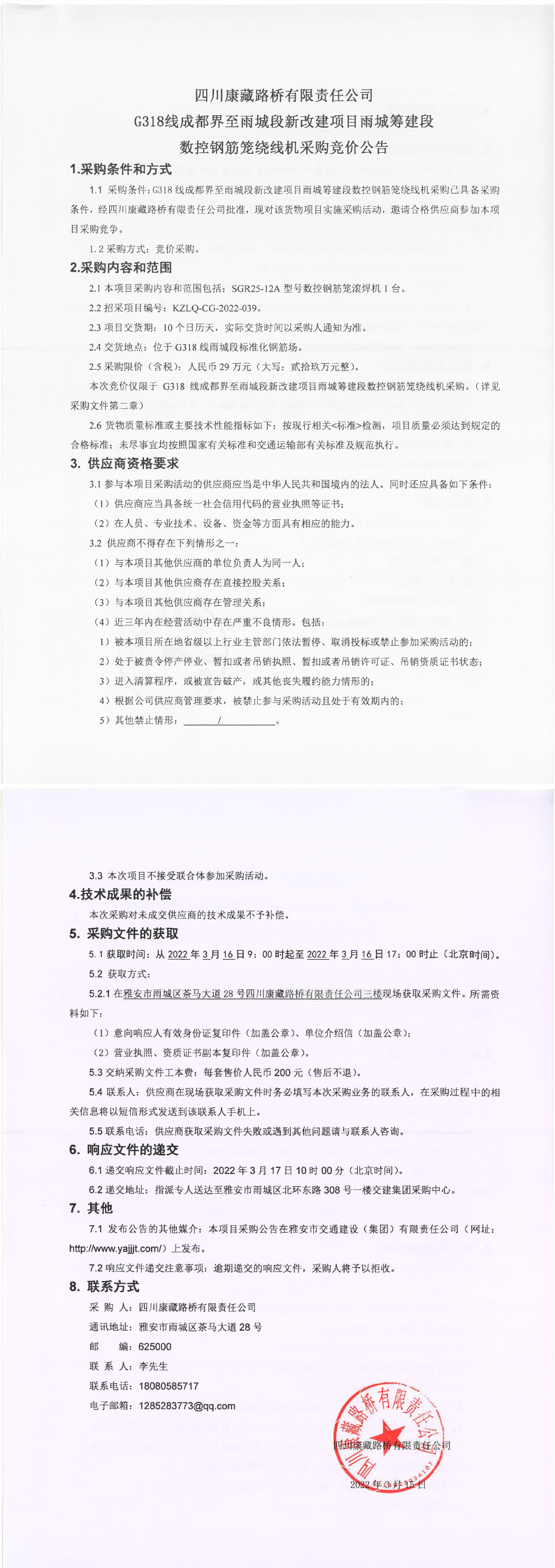 四川康藏路桥有限责任公司G318线成都界至雨城段新改建项目雨城筹建段数控钢筋笼绕线机采购竞价公告