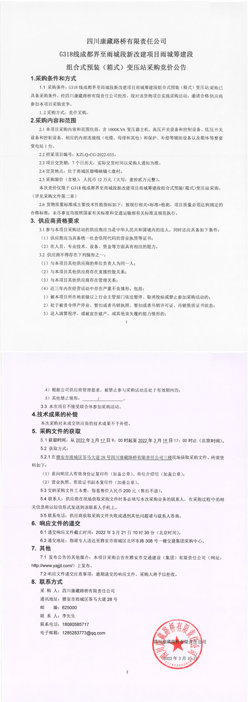 四川康藏路桥有限责任公司G318线成都界至雨城段新改建项目雨城筹建段组合式预装(箱式)变压站采购竞价公告