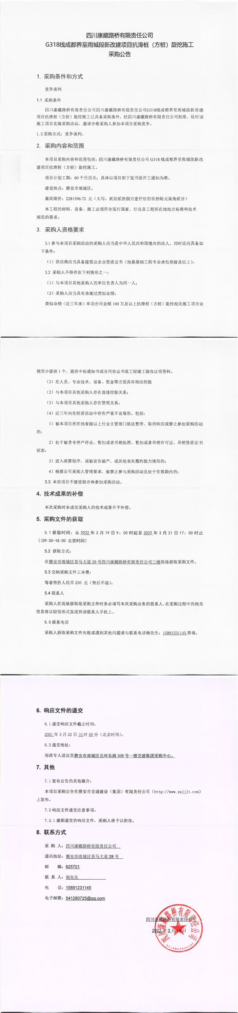 四川康藏路桥有限责任公司G318线成都界至雨城段新改建项目抗滑桩(方桩)旋挖施工采购公告
