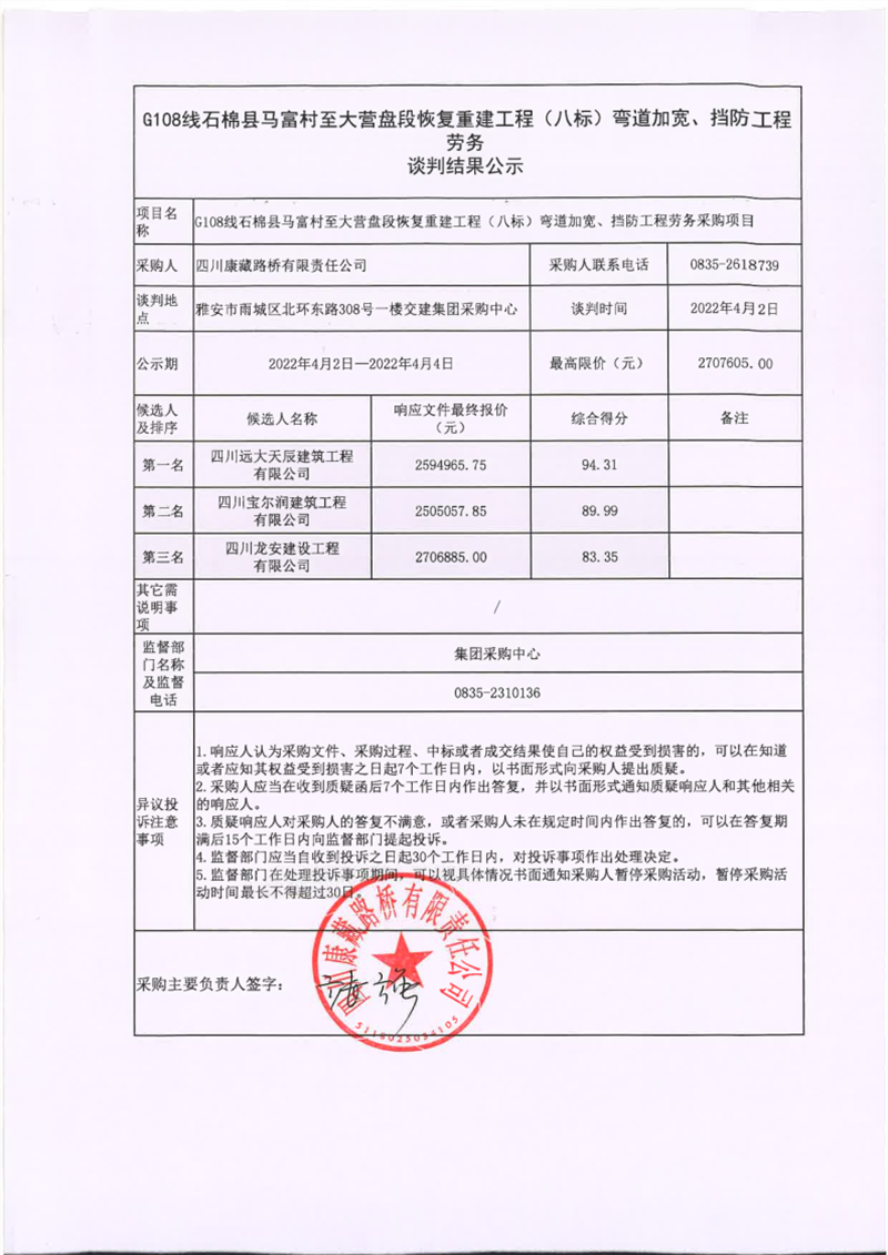 四川康藏路桥有限责任公司G108线石棉县马富村至大营盘段恢复重建工程(八标)弯道加宽、挡防工程劳务谈判结果公示