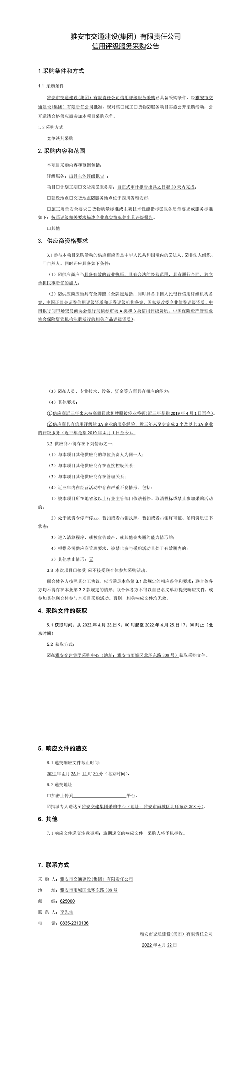 雅安市交通建设(集团)有限责任公司信用评级服务采购公告