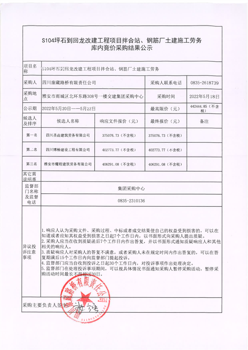 四川康藏路桥有限责任公司S104坪石到回龙改建工程项目拌合站、钢筋厂土建施工劳务库内竞价采购结果公示