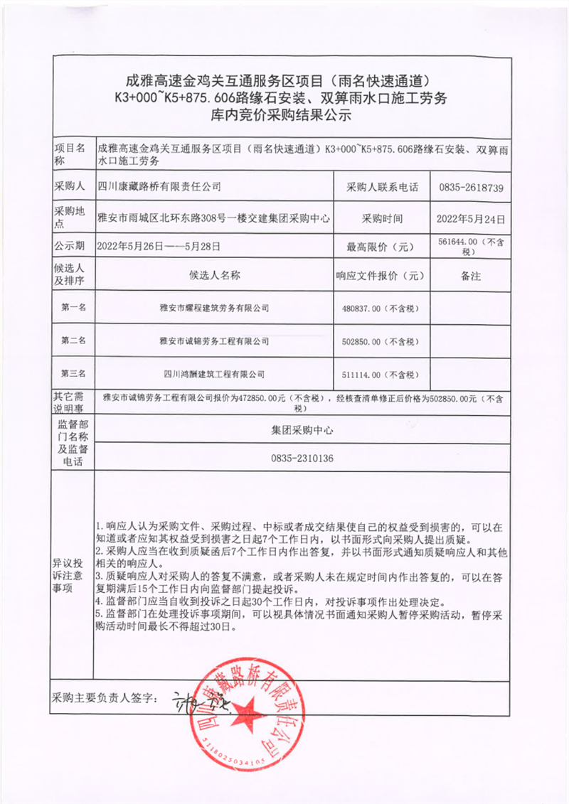 四川康藏路桥有限责任公司成雅高速金鸡关互通服务区项目(雨名快速通道)K3+000~K5+875.606路缘石安装、双箅雨水口施工劳务库内竞价采购结果公示