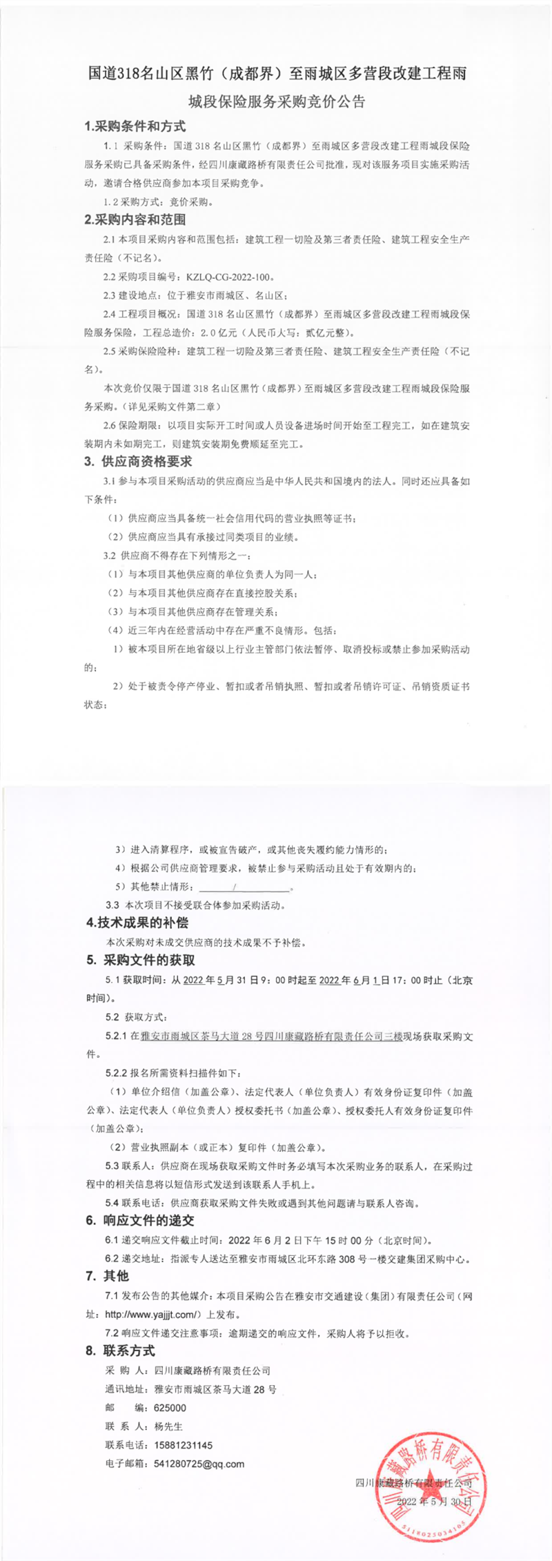 四川康藏路桥有限责任公司国道318名山区黑竹(成都界)至雨城区多营段改建工程雨城段保险服务采购竞价公告