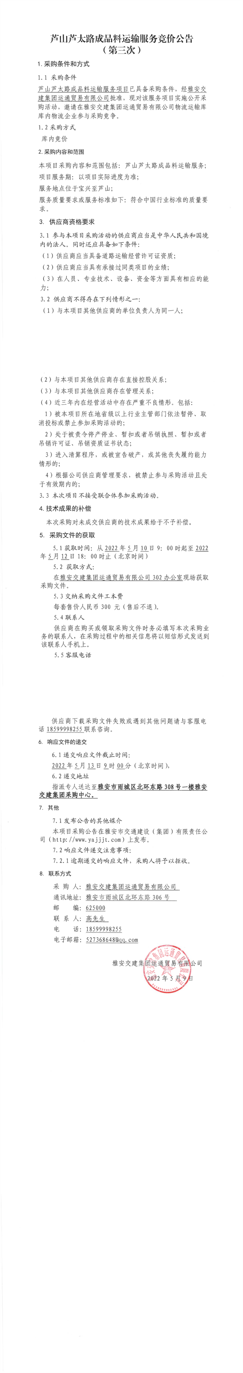 亿万先生MR集团运通贸易有限公司芦山芦太路成品料运输服务竞价公告(第三次)