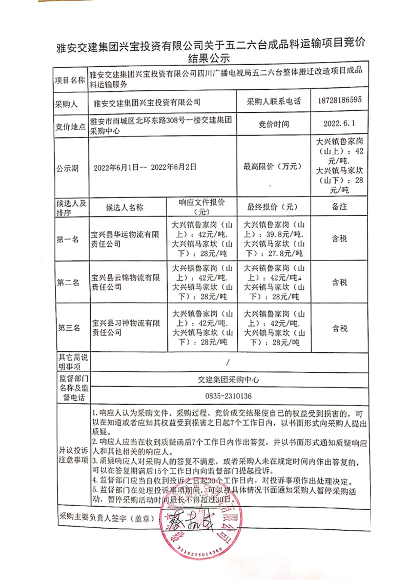 亿万先生MR集团兴宝投资有限公司关于五二六台成品料运输项目竞价结果公示