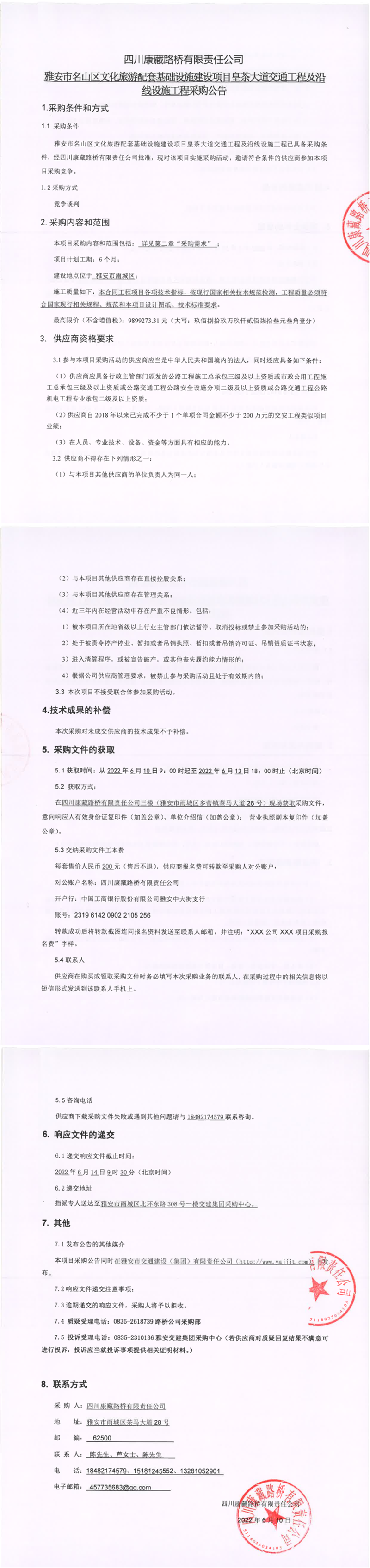 四川康藏路桥有限责任公司雅安市名山区文化旅游配套基础设施建设项目皇茶大道交通工程及沿线设施工程采购公告