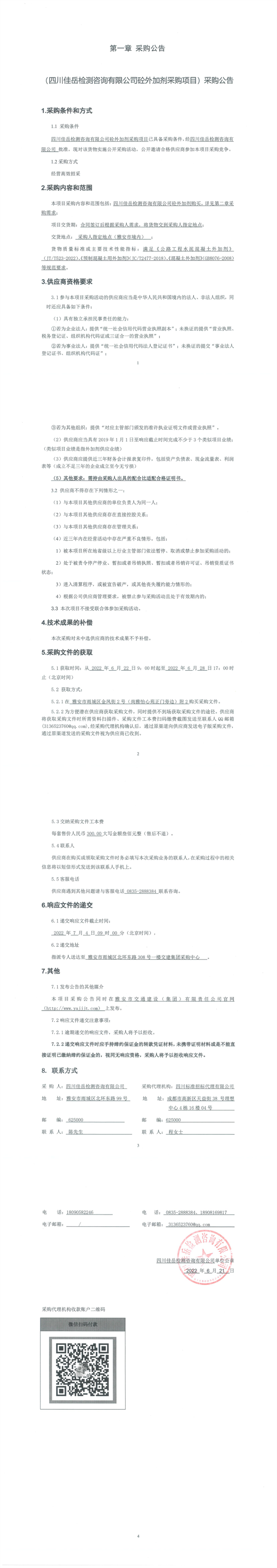 四川佳岳检测咨询有限公司砼外加剂采购项目采购公告