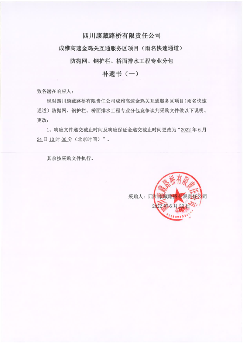 四川康藏路桥有限责任公司成雅高速金鸡关互通服务区项目(雨名快速通道)防抛网、钢护栏、桥面排水工程专业分包补遗书(一)