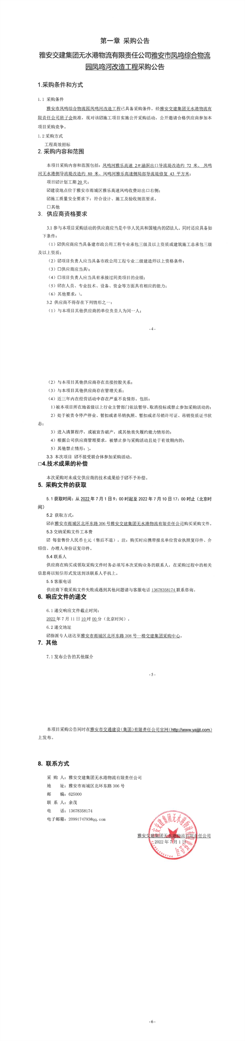 亿万先生MR集团无水港物流有限责任公司雅安市凤鸣综合物流园凤鸣河改造工程采购公告