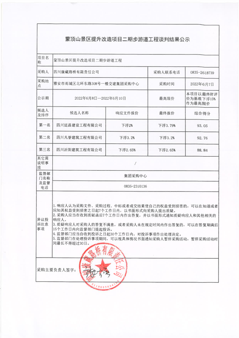 四川康藏路桥有限责任公司蒙顶山景区提升改造项目二期步游道工程谈判结果公示