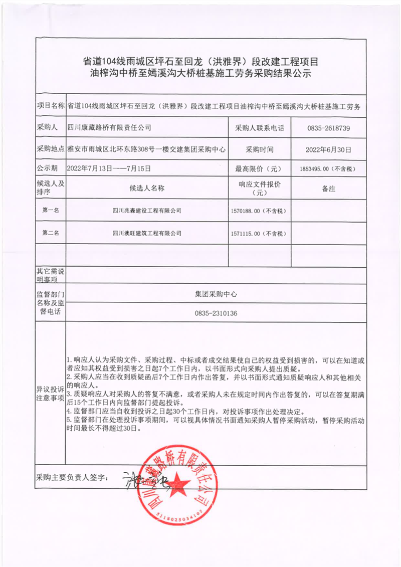 四川康藏路桥有限责任公司省道104线雨城区坪石至回龙(洪雅界)段改建工程项目油榨沟中桥至嫣溪沟大桥桩基施工劳务采购结果公示