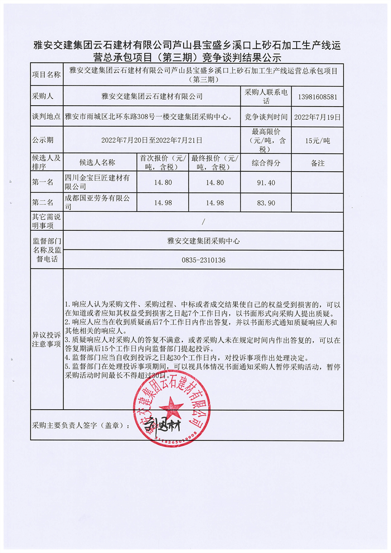 亿万先生MR集团云石建材有限公司芦山县宝盛乡溪口上砂石加工生产线运营总承包项目(第三期)竞争谈判结果公示
