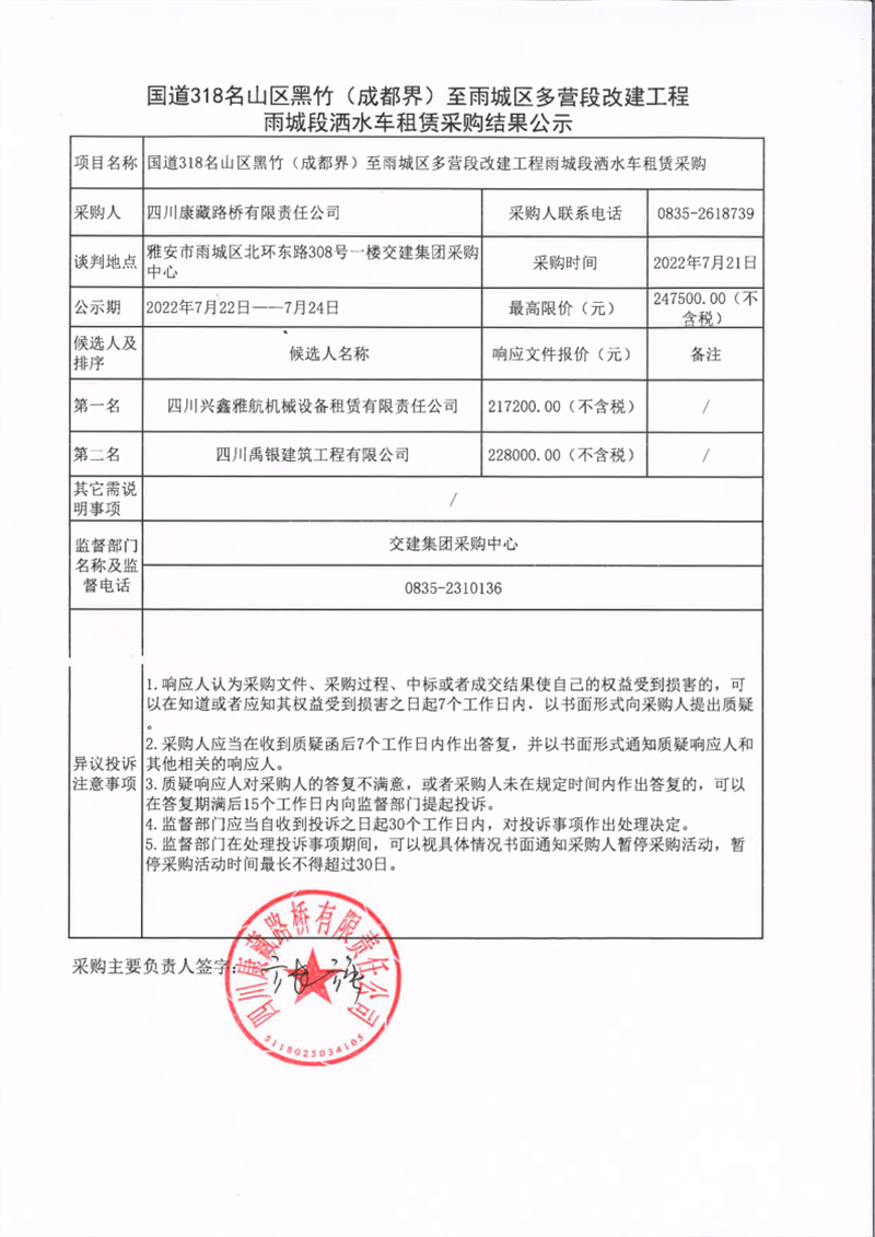 四川康藏路桥有限责任公司国道318名山区黑竹(成都界)至雨城区多营段改建工程雨城段洒水车租赁采购结果公示