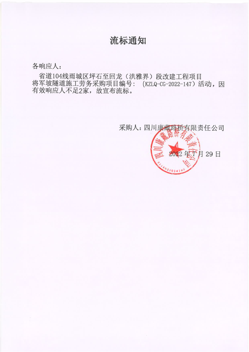 四川康藏路桥有限责任公司省道104线雨城区坪石至回龙(洪雅界)段改建工程项目将军坡隧道施工劳采购流标通知