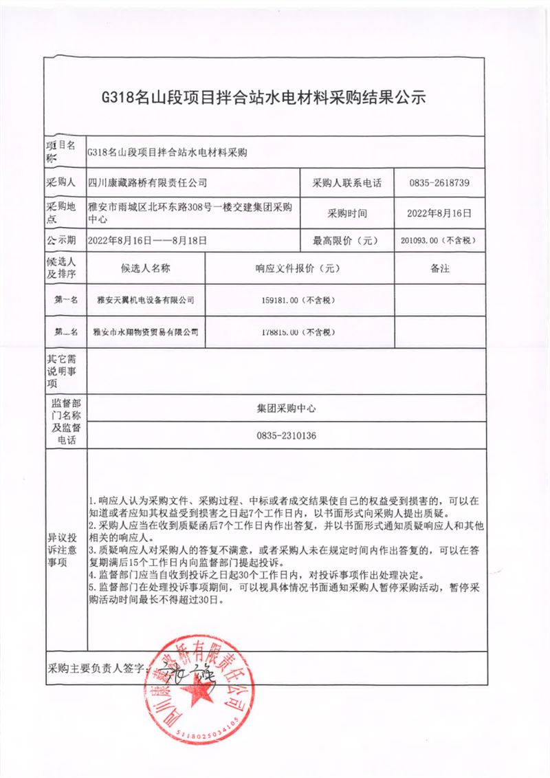四川康藏路桥有限责任公司G318名山段项目拌合站水电材料采购结果公示