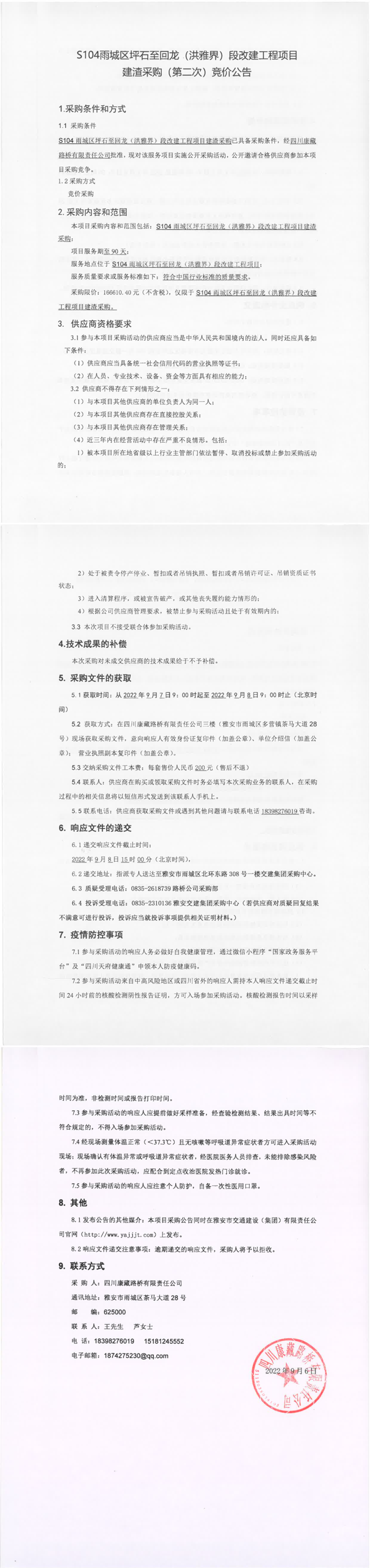 四川康藏路桥有限责任公司S104雨城区坪石至回龙(洪雅界)段改建工程项目建渣采购(第二次)竞价公告