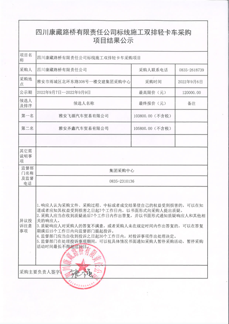 四川康藏路桥有限责任公司标线施工双排轻卡车采购项目结果公示