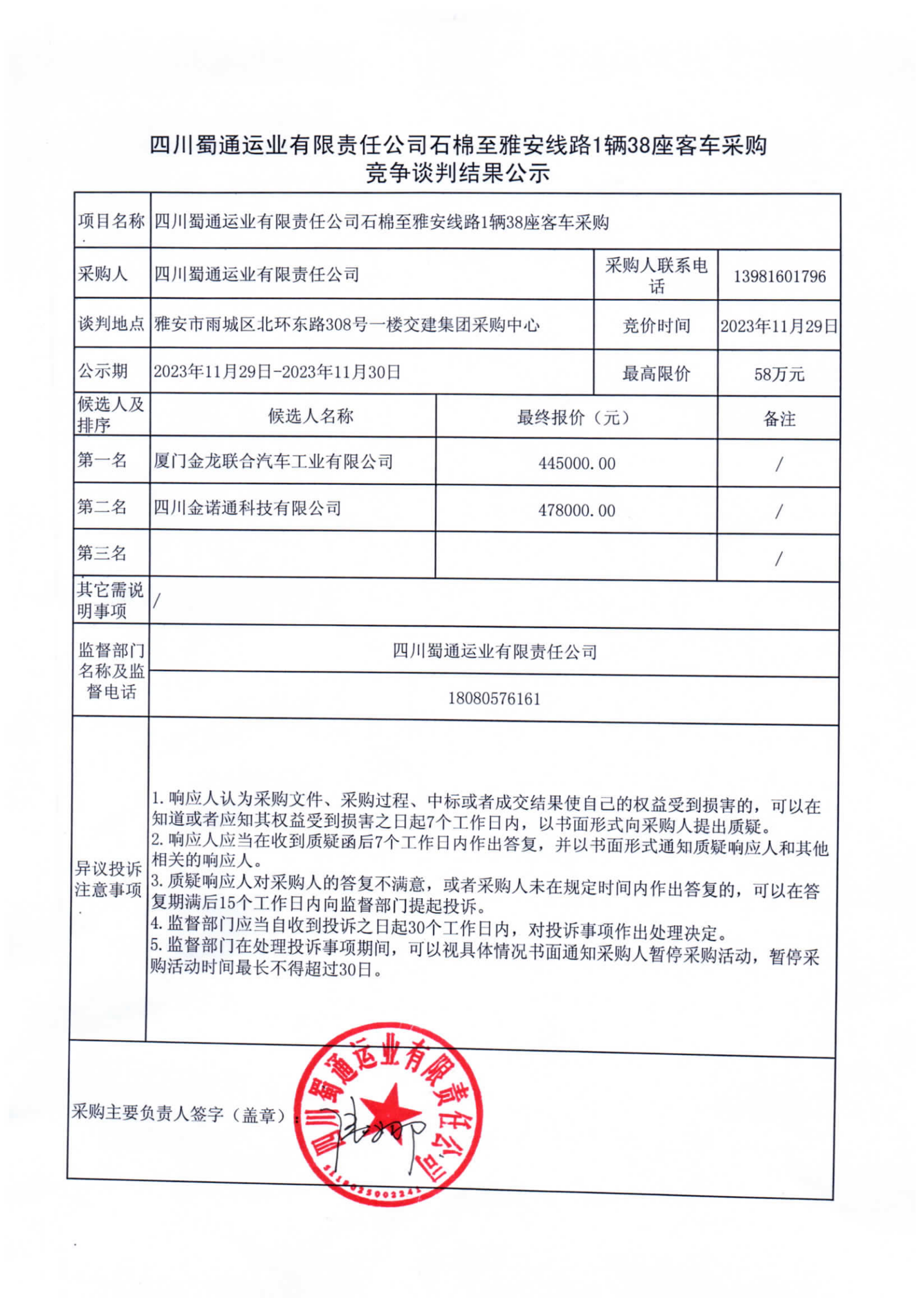 四川蜀通运业有限责任公司石棉至雅安线路1辆38座客车采购竞争谈判结果公示