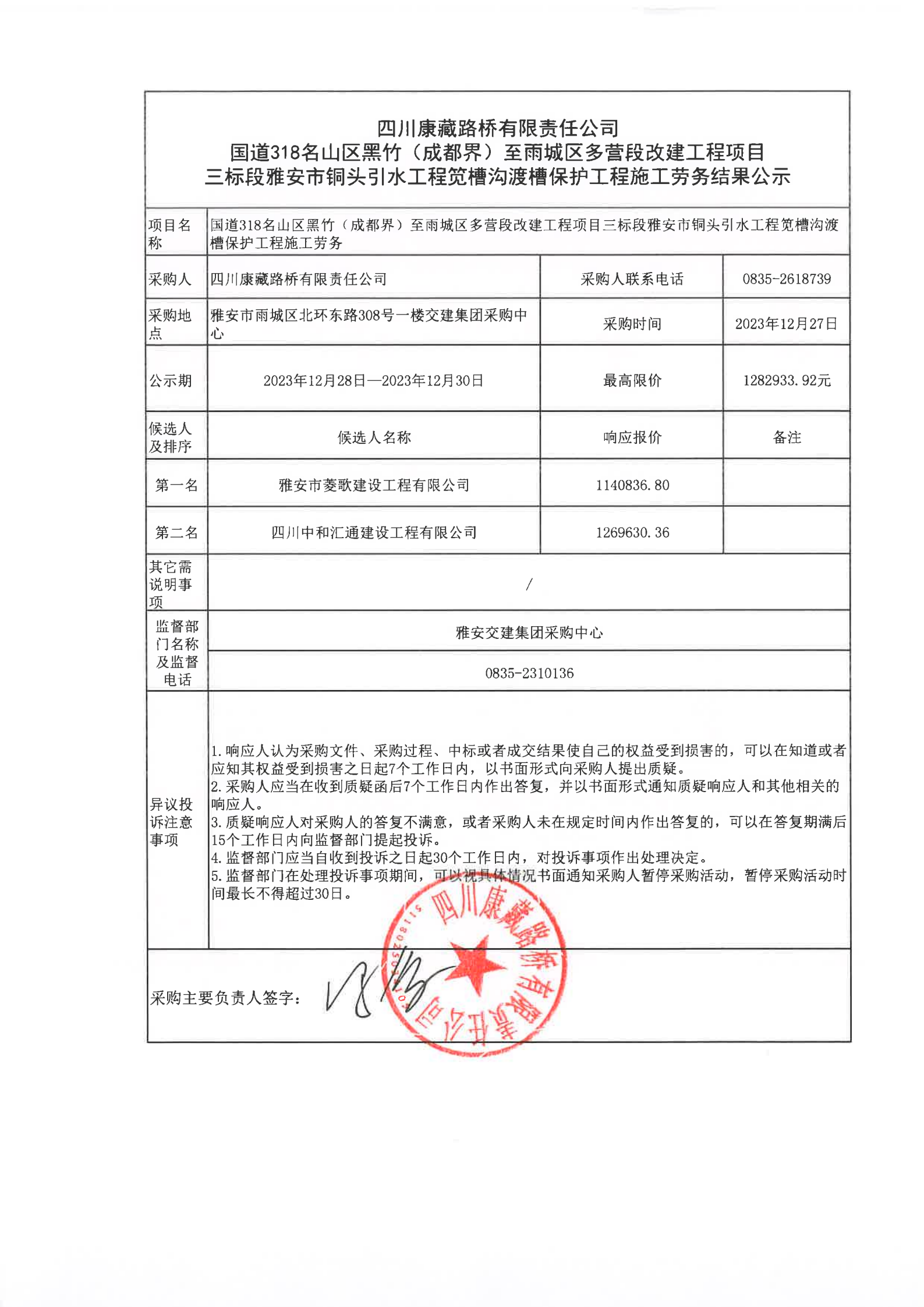 四川康藏路桥有限责任公司国道318名山区黑竹(成都界)至雨城区多营段改建工程项目三标段雅安市铜头引水工程笕槽沟渡槽保护工程施工劳务结果公示
