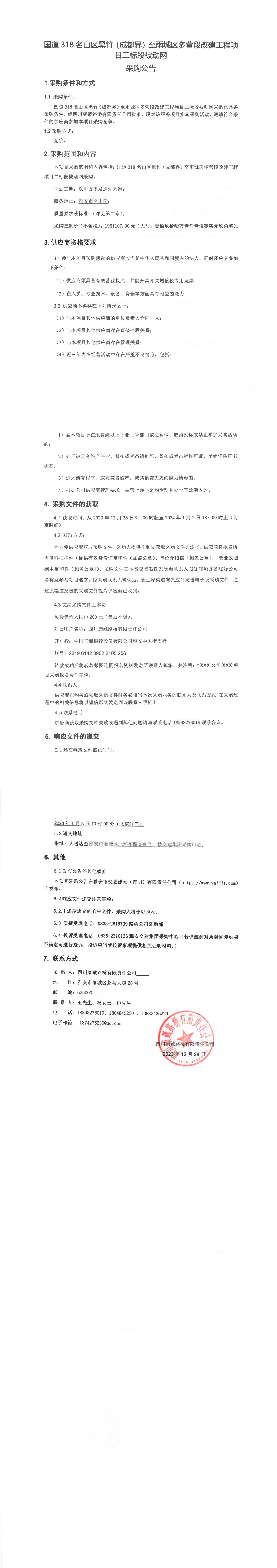 四川康藏路桥有限责任公司国道318名山区黑竹(成都界)至雨城区多营段改建工程项目二标段被动网采购公告
