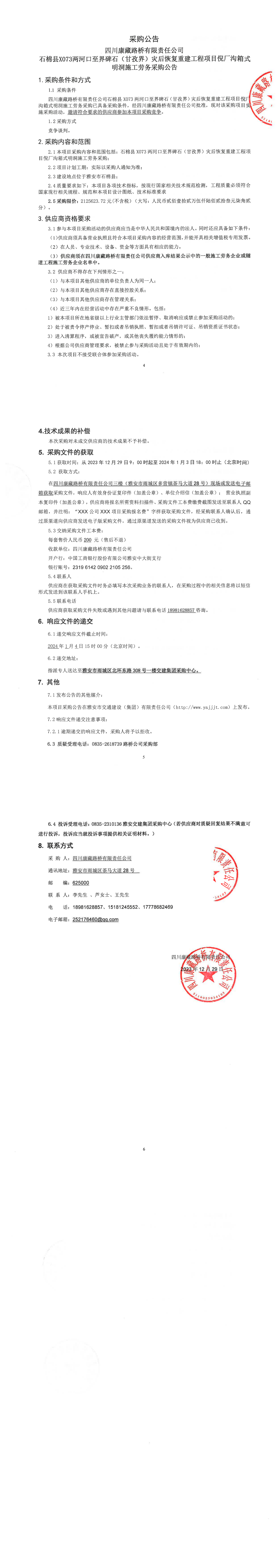 四川康藏路桥有限责任公司石棉县X073两河口至界碑石(甘孜界)灾后恢复重建工程项目倪厂沟箱式明洞施工劳务采购公告