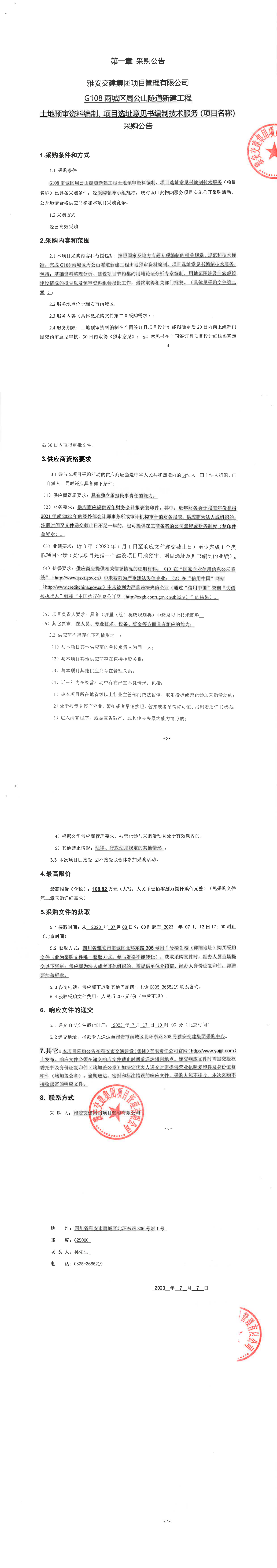 亿万先生MR集团项目管理有限公司G108雨城区周公山隧道新建工程土地预审资料编制、项目选址意见书编制技术服务(项目名称)采购公告