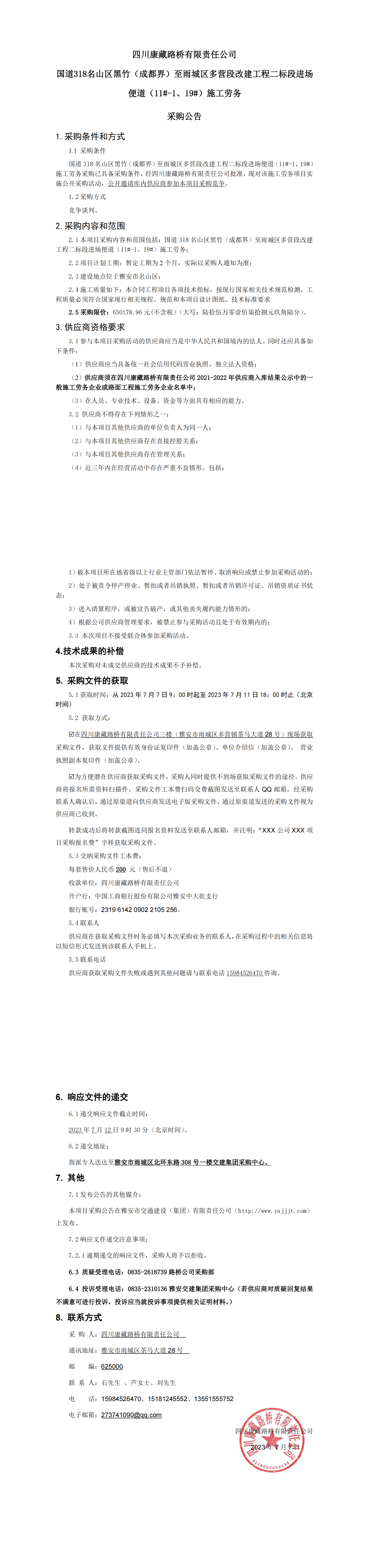 四川康藏路桥有限责任公司国道318名山区黑竹(成都界)至雨城区多营段改建工程二标段进场便道(11#-1、19#)施工劳务采购公告
