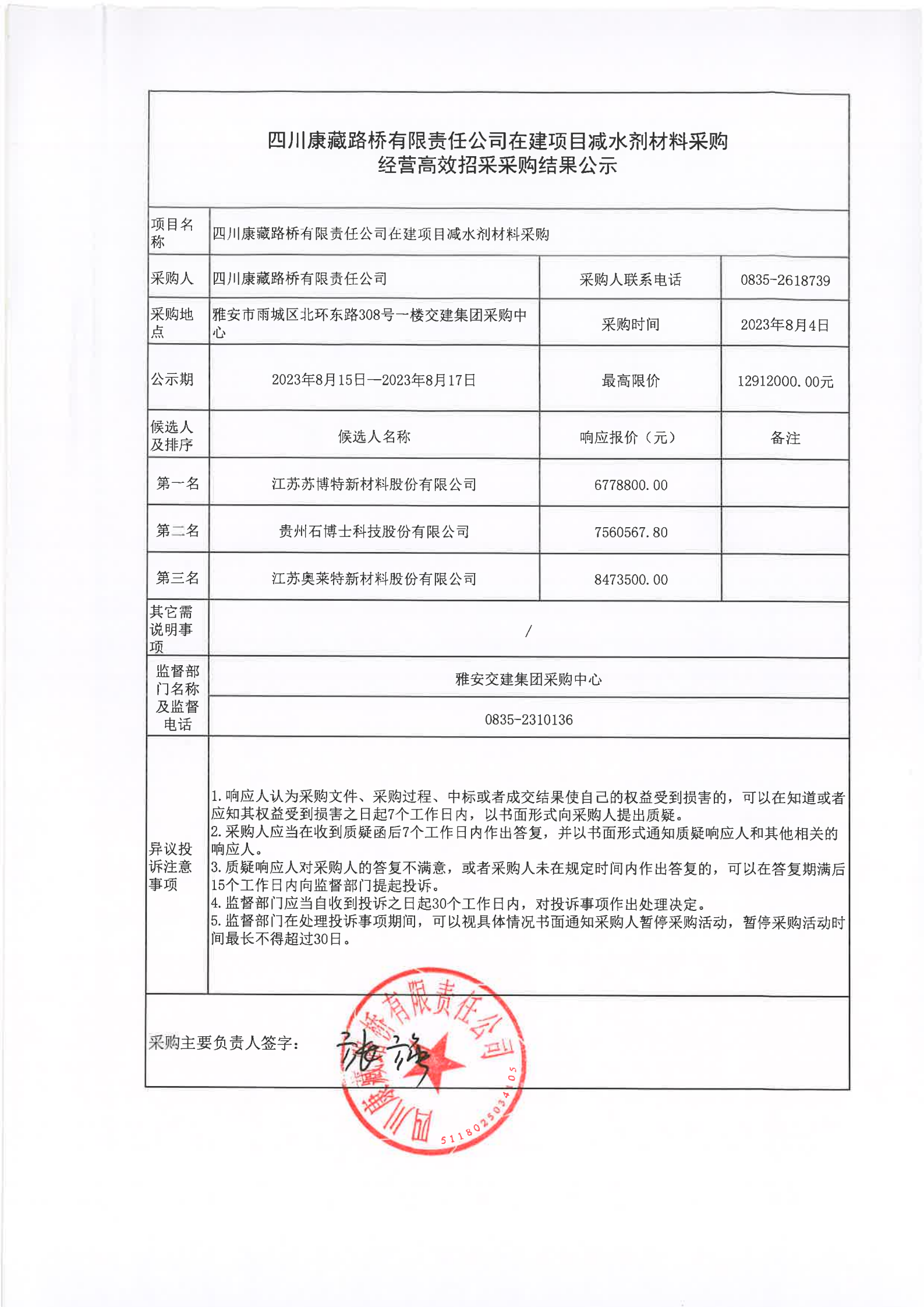 四川康藏路桥有限责任公司在建项目减水剂材料采购经营高效招采采购结果公示