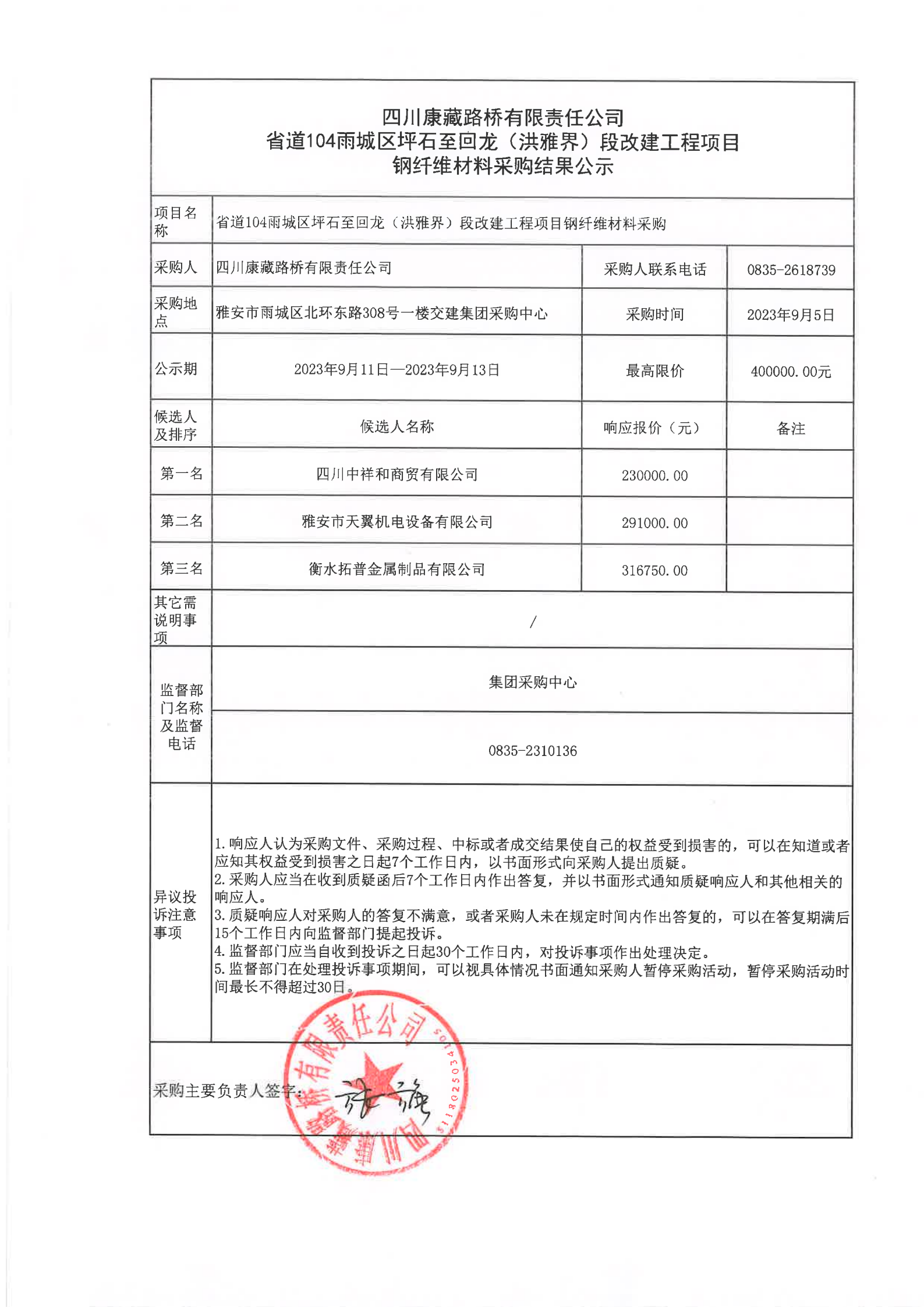 四川康藏路桥有限责任公司省道104雨城区坪石至回龙(洪雅界)段改建工程项目钢纤维材料采购结果公示