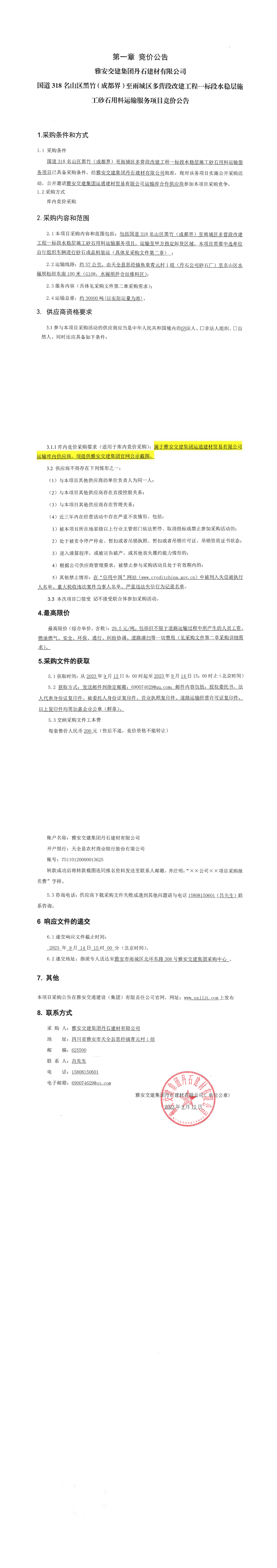 亿万先生MR集团丹石建材有限公司国道318名山区黑竹(成都界)至雨城区多营段改建工程一标段水稳层施工砂石用料运输服务项目竞价公告