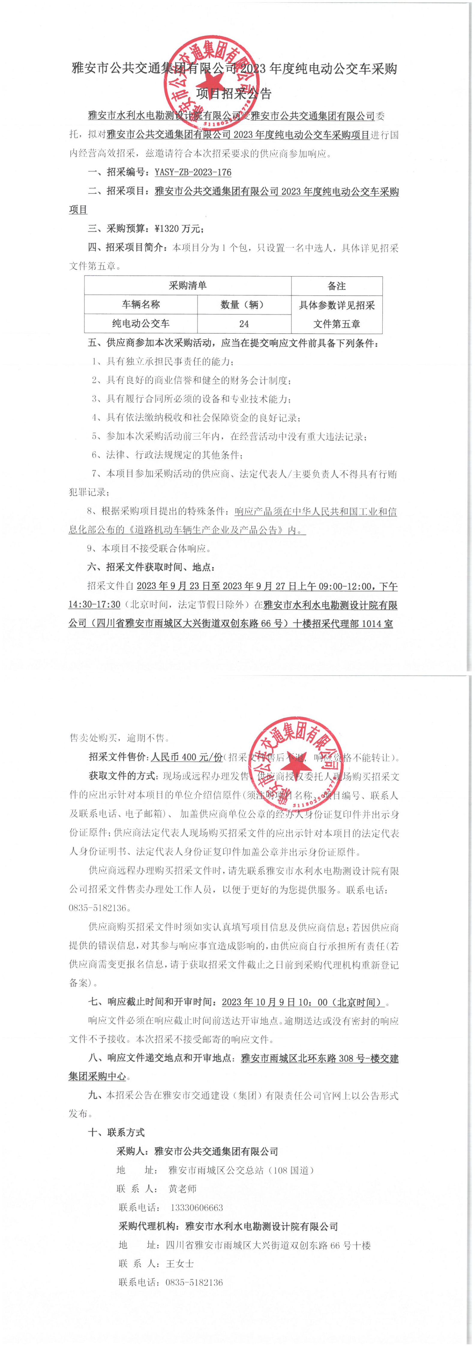 雅安市公共交通集团有限公司2023年度纯电动车公交车采购项目招采公告