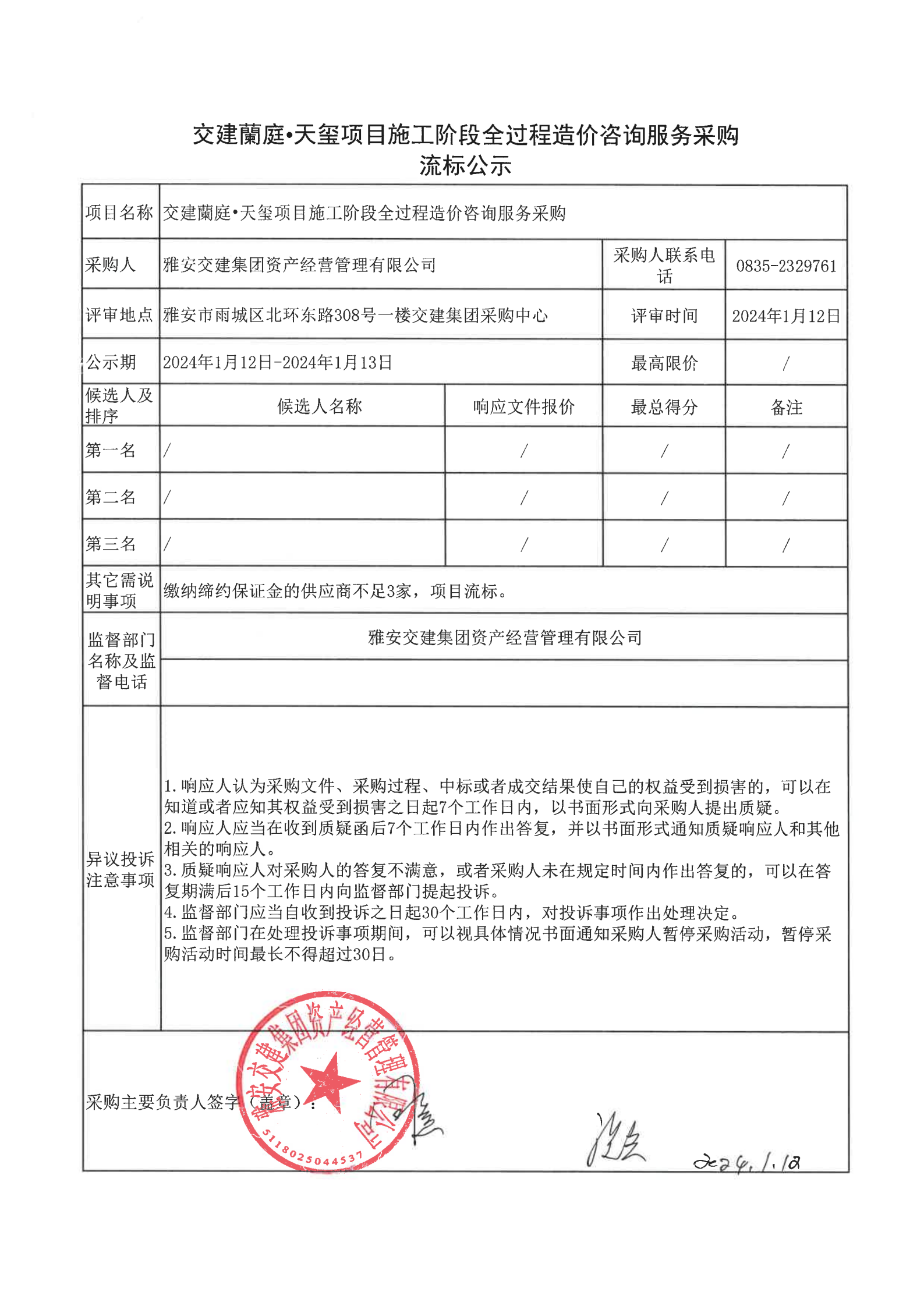 亿万先生MR集团资产经营管理有限公司交建蘭庭·天玺项目施工阶段全过程造价咨询服务采购流标公示