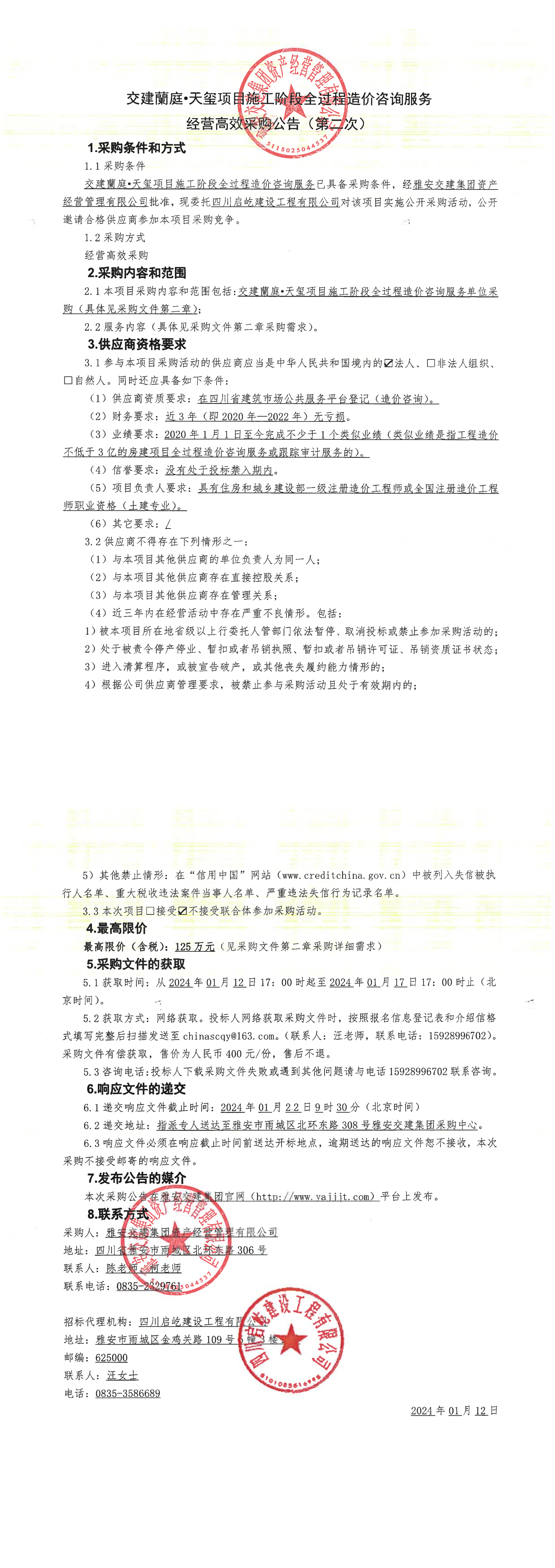 亿万先生MR集团资产经营管理有限公司交建蘭庭·天玺项目施工阶段全过程造价咨询服务经营高效采购公告(第二次)
