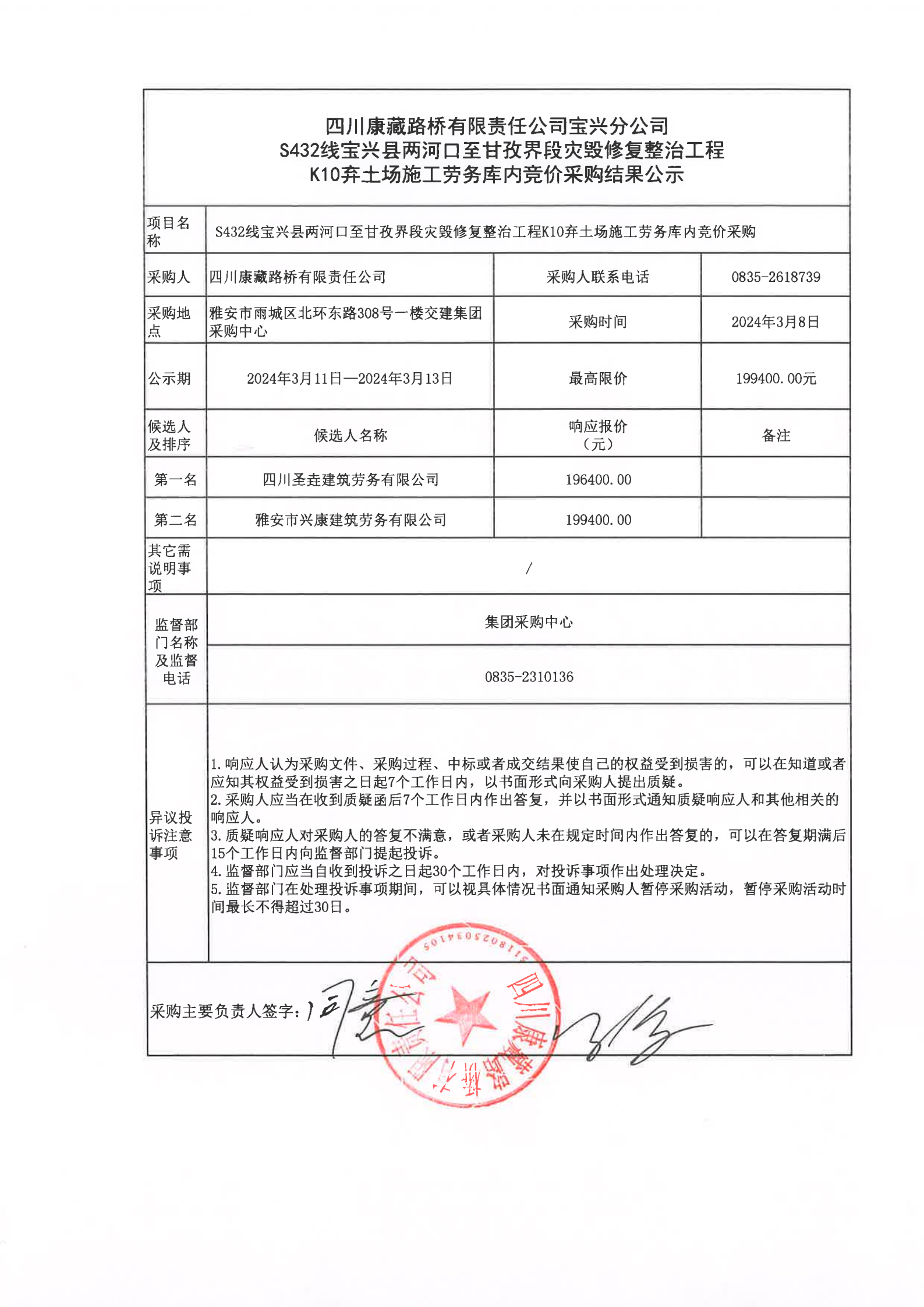 四川康藏路桥有限责任公司宝兴分公司S432线宝兴县两河口至甘孜界段灾毁修复整治工程K10弃土场施工劳务库内采购结果公示