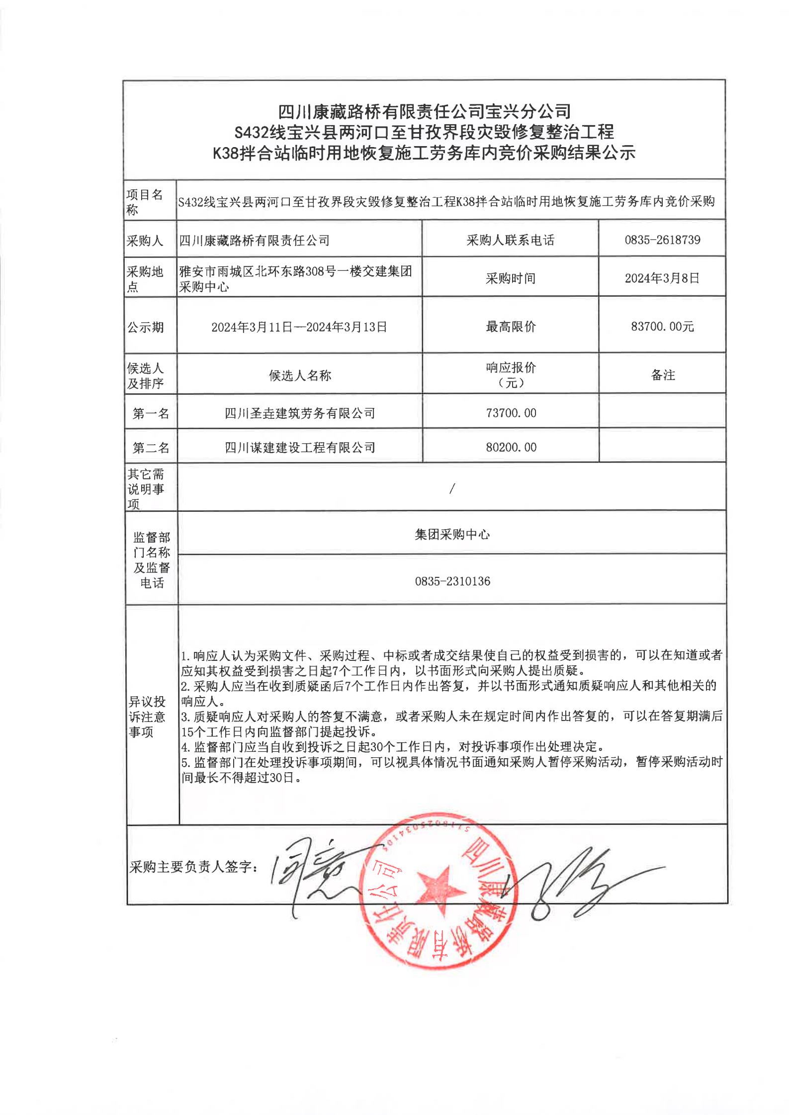 四川康藏路桥有限责任公司宝兴分公司S432线宝兴县两河口至甘孜界段灾毁修复整治工程K38拌合站临时用地恢复施工劳务库内竞价采购结果公示