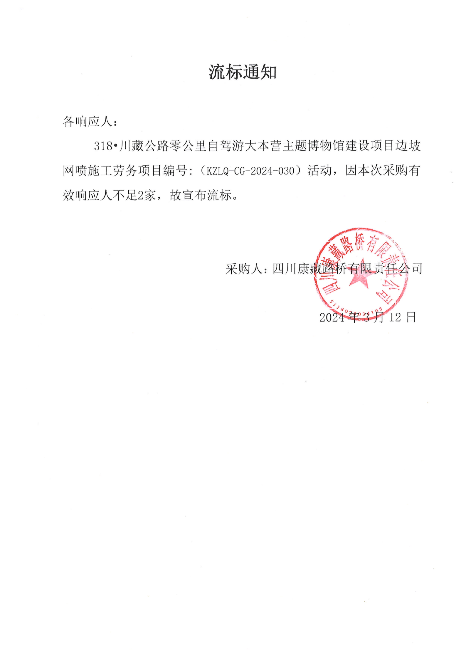 四川康藏路桥有限责任公司318·川藏公路零公里自驾游大本营主题博物馆建设项目边坡网喷施工劳务流标通知
