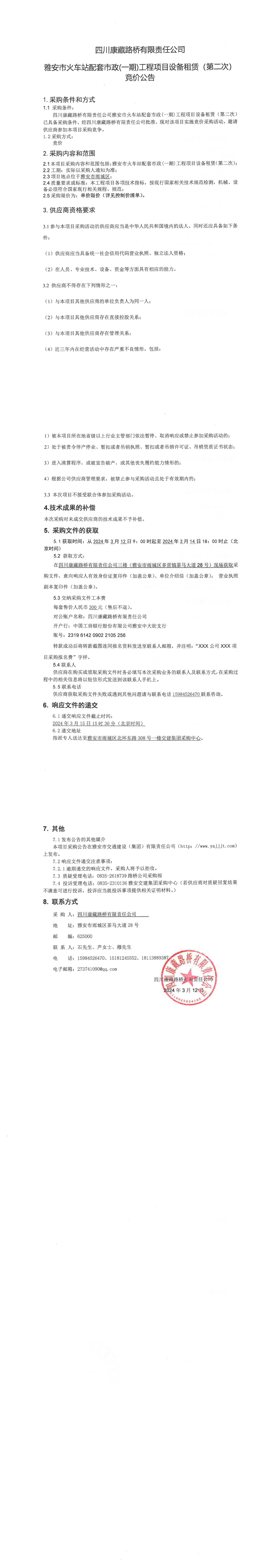 四川康藏路桥有限责任公司雅安市火车站配套市政(一期)工程项目设备租赁(第二次)竞价公告