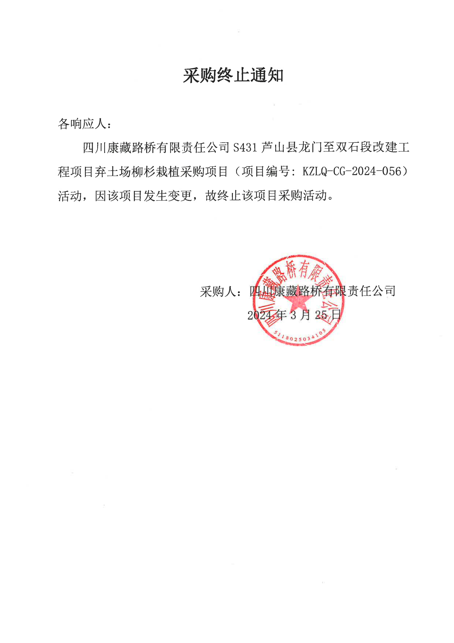 四川康藏路桥有限责任公司S431芦山县龙门镇至双石段改建工程项目弃土场柳杉载植采购终止通知