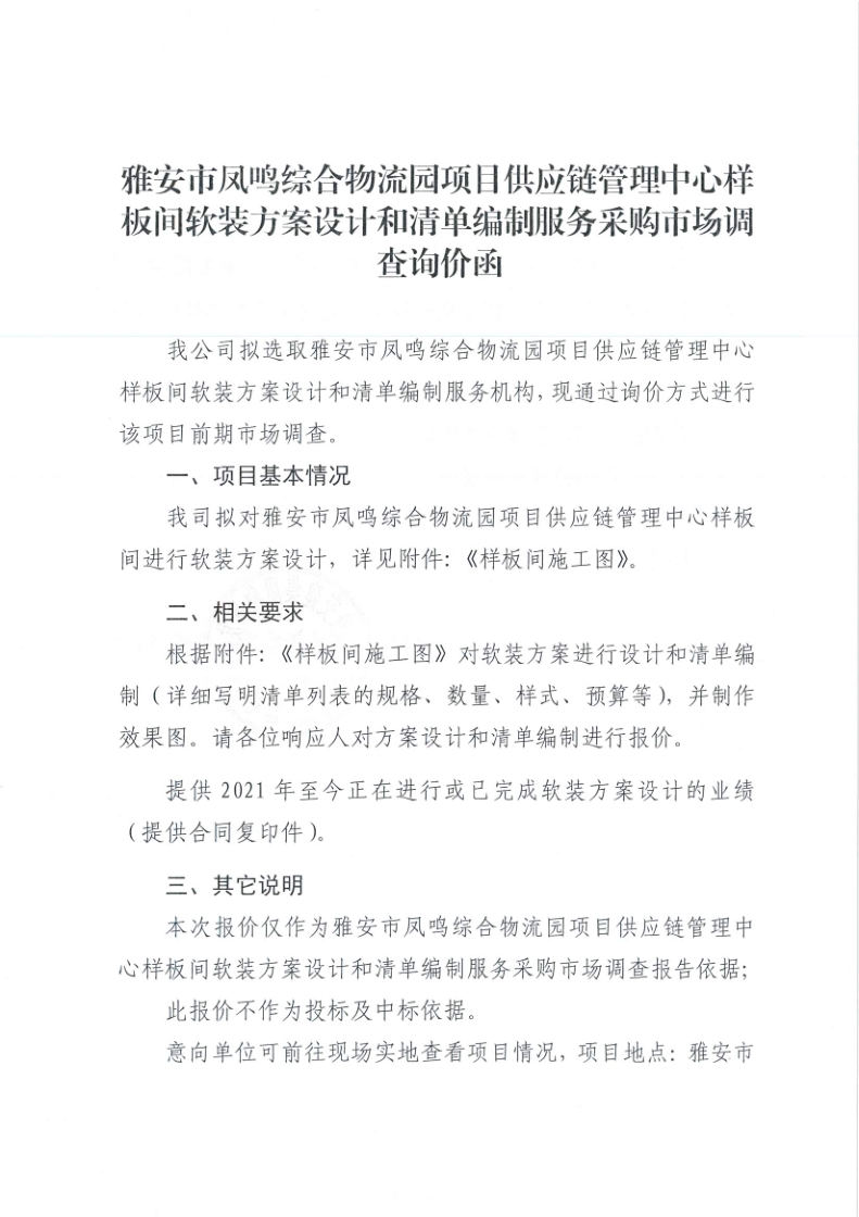 亿万先生MR集团物流开展有限公司雅安市凤鸣综合物流园项目供应链管理中心样板间软装方案设计和清单编制服务采购市场调查询价函